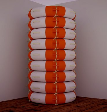 Tek bir can simidini meydana getirecek şekilde uçları birbiri içine girmiş dört ayrı silindirik kauçuk tüpün, bunları tutan dört adet uçları boş ama atıldığı tekneye bağlı hayat ipinin birarada tuttuğu batmaz parçalar ortasına girecek beşinci kişiyi de hayatta tutmayı sağlayacak bir can simidi oluşturur.